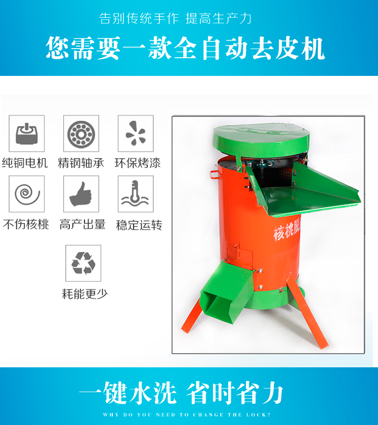 1、本產品是我廠新研發的新型青核桃剝皮、清洗一體機。該機具有重量輕,體積小,便于運輸,操作簡單,使用靈活,加工效率高。