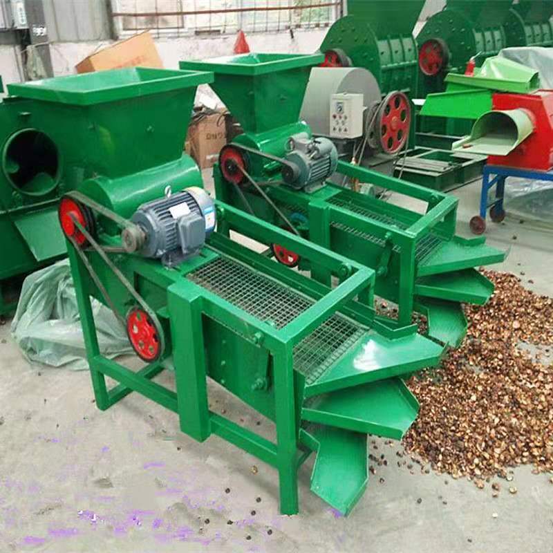 茶籽由人工送入進料斗,先滾到滾筒里,由于紋板轉動與棚條凹板間的搓力,將茶籽殼,仁剝離,剝離后的茶籽仁與殼同時經過前凹板孔落下,在通過風道時,由風離將大部分茶籽殼吹出機外,一小部分未剝離的茶籽小果一起落入比重分選篩,經過篩選后由分選篩面上行,通過出米嘴流入麻袋。