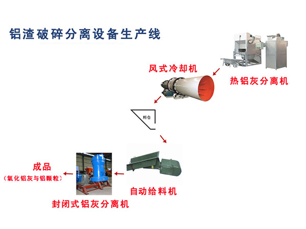 單獨(dú)的熱鋁灰轉(zhuǎn)化冷鋁灰分離生產(chǎn)線:熱鋁灰→→風(fēng)式冷卻機(jī)→→料倉(cāng)→→自動(dòng)給料機(jī)→→封閉式鋁灰分離機(jī)→→成品(氧化鋁灰與鋁顆粒)